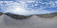 a wide angle photograph of the dirt road of an outdoor area, with a man in distance