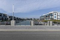 This image depicts a coastal road in Toronto, Canada. The asphalt road is lined with residential houses and buildings, with windows overlooking the ocean. The clear sky with clouds reflects a beautiful day in Toronto. The road surface and curb are well-maintained and there are street lights along the way. The urban design blends well with the natural vegetation and harbor. This photo captures the essence of the city, showcasing its waterfront and architectural beauty.