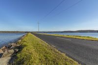 Coastal road with power lines traversing through a picturesque landscape. Clear sky above a peaceful body of water. Lush grass and vegetation adorn the hillside. A serene day by the ocean.