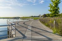 A scenic view of a coastal road in Wisconsin, surrounded by lush green landscape. The road surface is made of concrete, with a handrail and guard rail for safety. The clear blue sky and contrails add to the picturesque scene.