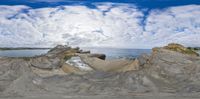 the view of the ocean through the spherical lens of a landscape and rock formation on an overcast day