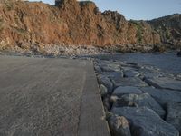 This image captures the beauty of a coastal landscape in Portugal, Europe during the early morning dawn. The clear sky provides a stunning backdrop for the mountains and open space ahead. The water of the ocean gently caresses the rocky bedrock and outcrop, showcasing the natural geology and formations of the area. In the distance, a road surface can be seen leading towards the horizon. This photo represents the peacefulness and serenity of nature at break of day in Portugal, Europe.