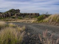 a grassy, rocky terrain area with a trail and grassy field with plants in the background