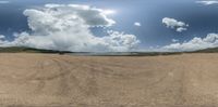 a panoramic photo of a beach with sand and a large cloud over a lake