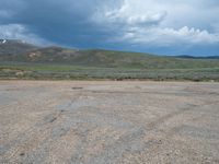 An open space along the coastal area of Utah, with a gloomy and grey sky above. The gravel surface leads to a dirt area, with a view of the ocean and lake in the distance.