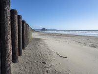 A picturesque view of a sandy beach shoreline in California, USA. The image shows a line of old wooden posts leading towards the clear blue ocean water and distant mountains. The open space and clear sky create a serene atmosphere, perfect for a day at the beach. The sandy shore, along with the presence of trees, adds to the natural beauty of the coastal landscape. The image captures the essence of a peaceful coastal environment, with the waves gently hitting the shore and the wooden posts standing tall amidst the sandy surface.
