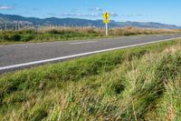 A rural road in New Zealand leads to a coastal overlook. The road is surrounded by tall grass and mountains in the distance. A clear day provides an overview of the ocean view.
