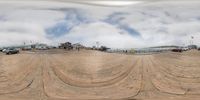 a view of a skateboard ramp in the sand near cars and buildings on it