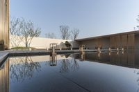 A sunny day in a coastal villa with modern architecture. The house is surrounded by open space, a garden, and a courtyard. The reflection of the clear sky and sun can be seen on the water surface. A perfect property for those who love to enjoy the outdoors.