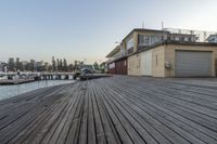 A wooden boat ramp extending into the calm waters of the ocean. The straight wood planks create a visual path leading to the pier. With the break of day, the clear sky reflects on the hardwood floor.
