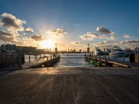 This is a sunrise view of a coastal city in Florida, specifically Miami Beach. The photo captures the stunning landscape of the city with its urban design and coastal features. The sun is visible on the water's surface, creating a sunny and vibrant atmosphere. In the foreground, there is a pier and boat ramp, adding to the coastal charm of the area. The clear sky and beautiful coastline make this an ideal location for nature lovers and those seeking a serene coastal experience in Miami.