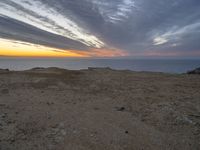 This is an image of a coastal landscape in Europe, specifically Portugal. The picture captures the beautiful sky filled with cumulus clouds and an afterglow as the day breaks. The photo shows a cliff overlooking the ocean, with a sandy beach below. The landscape includes open spaces with dirt and gravel surfaces. The coastline features rugged cliffs and crags. The image showcases the natural beauty of the European coastline and the tranquil scene of the beach meeting the water.