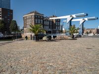 This image showcases the unique architecture and urban design of Holland, Europe. The photo captures an open space surrounded by classic and modern buildings, with a cobblestone courtyard and a water feature in the foreground. The clear sky reflects on the surface of the lake, adding to the serene atmosphere. The vegetation adds a touch of green to the landscape, and the line of trees adds depth and dimension to the scene. This photo represents a typical day in a public space in Holland, showcasing the combination of classic and modern architecture.