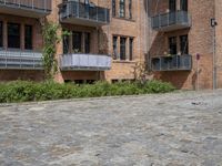 A classic brick courtyard in Berlin, Germany. The brick surface is lined with neatly piled bricks. The clear sky overhead and the surrounding residential houses contribute to the charming ambiance of the European city.