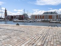 This image captures the classic architecture and cobblestone road of Bremen, Germany. The city's historic buildings and modern architecture blend together in this scenic urban setting. Boats are docked along the water's edge, giving a glimpse of the bustling harbor and city life. The cloudy sky adds a dramatic backdrop to this European cityscape. This photo showcases the unique combination of old and new in Bremen, creating a charming and vibrant atmosphere.
