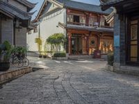 This is an image of a charming residential neighborhood in the old town of Lijiang, Yunnan, China. The historic architecture features classic buildings with cobblestone roads and low-rise houses. The clear sky adds to the picturesque setting of the village. The image showcases the unique charm and beauty of this suburban area, which is a popular destination for tourists. With its traditional courtyard homes and small roads, this old village captures the essence of Chinese culture and history. It's a perfect representation of the harmonious blend of traditional and modern lifestyles in China.