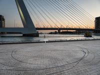 This is a beautiful image captured during the break of day in Holland, Netherlands. The photo shows a person walking on a stone pathway by the water, with the city skyline in the background. The clear sky reflects on the calm surface of the lake, creating a serene and peaceful atmosphere. The modern architecture of the buildings and cable-stayed bridge add a touch of urban design to the scene. This photo represents the unique blend of history, architecture, and natural beauty of Holland.