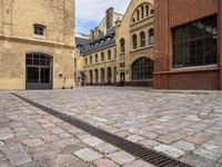 A classic Berlin street filled with cobblestone charm. Buildings line the road, each adorned with windows and brick facades. The European architecture adds to the romance of the open courtyard.