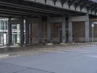This image showcases the architecture and urban design of Berlin, Germany. In the foreground, a concrete bridge and underpass can be seen, along with a cobblestone road. The reflection of buildings and columns adds an artistic touch to the scene. The photo captures the essence of city life in Berlin, a vibrant and dynamic European city. The combination of contemporary and historical structures represents the unique blend of old and new in Berlin's art district. This image is a perfect representation of urban life and design in Europe.