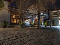 An empty cobblestone street in the historic city of Lijiang, China at night. The low lighting adds a mysterious ambiance. The old town is lined with buildings, cafes, and shops.