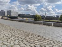 This image captures the modern architecture of Berlin, Germany. The cityscape showcases a blend of contemporary and historic buildings, reflected on the surface of a calm lake. The clear sky above highlights the urban design and infrastructure, with roads and tree-lined avenues leading to the water's edge. A pier and jetty provide access to the river, while cobblestone streets intersect with asphalt roads. This photo represents the intersection of architecture, nature, and water resources in the vibrant city of Berlin.
