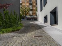A serene cobblestone courtyard in Porto, Portugal, under a clear sky. The traditional European surface of the driveway leads to an inviting entry. Experience a peaceful day in this Hinterhof.