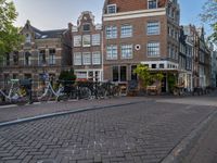 An iconic scene in the heart of Amsterdam, Netherlands. Cobblestone road lined with bicycle racks and classic architecture. A bustling city with a vibrant café culture and charming residential areas.