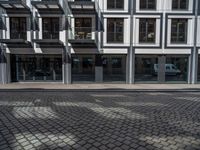 A daytime view of a modern office building in Berlin's business district. The hard shadows cast on the cobblestone road and residential areas showcase the unique architecture of urban design in this European city.