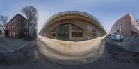 Panoramic view of a classic European building in Berlin. The city's architecture, cobblestone roads, and colorful facades create a charming atmosphere. Sunlight casts long shadows on the straight road, adding to the urban vibe.