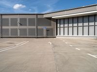 A straight road in Berlin, lined with cobblestones and surrounded by urban architecture. Clouds create a dramatic backdrop against the concrete surface. The road leads to a parking deck, showcasing the city's urban design.