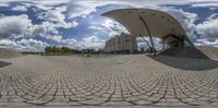a very big and neat looking circular building in the middle of the park with a blue sky background