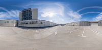Aerial view of Berlin's urban landscape. Cobblestone roads and concrete streets intersect, leading to an open space with a parking garage. Metal walls and straight road lines create an urban design. Clouds fill the sky above.