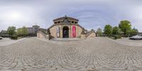 A fish-eye lens captures a unique perspective of a building in Berlin, Germany. The architecture showcases a blend of classic and modern design. The city's vibrant atmosphere is reflected in the cobblestone roads and green open spaces. Explore the rich history and culture of this European metropolis.