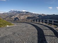 This stock photo features a scenic view of a cobblestone roadway near a mountain range in Italy. The road is surrounded by lush vegetation and is accompanied by a long curved bridge. The clear sky and fluffy clouds add to the beauty of this picturesque landscape. The rugged mountain landforms create a stunning backdrop for this rural highland scene. The road surface is made of cobblestones and is lined with a guard rail and Armco barrier. This peaceful scene captures the essence of nature in Europe, specifically in Italy.