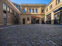 an empty brick paved building surrounded by buildings and businesses on a street corner at the center of a square