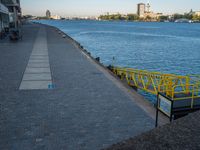 A modern urban landscape in Holland, featuring impressive architecture and a straight road leading to the city center. The city is situated along the beautiful waterfront, with clear skies overhead. The infrastructure includes open spaces, cobblestone streets, and a harbor with boats and piers.