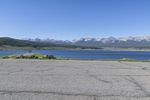 Open road surrounded by the stunning landscape of Crested Butte, Colorado. Clear sky contrasts with the azure waters of Taylor Park Reservoir. Evergreen trees line the road, creating a picturesque scene.
