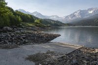 A breathtaking view of the Colorado landscape at dawn. Mountains, forests, and a clear sky reflect on the calm waters of a lake. A road winds through the highlands, leading to a reservoir for recreational activities. Nature at its finest in Colorado.