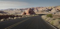 A scenic view of a straight road cutting through the rugged landscape of Colorado's badlands. The road leads towards majestic mountains in the distance. Dawn sky is clear with contrails streaking across it.