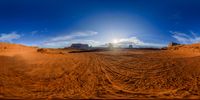 A stunning view of the Colorado desert at dawn. The road stretches across the open plain, surrounded by rugged mountains and rocky outcrops. The sun casts a warm golden light, creating a breathtaking landscape.