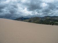 A gloomy day at Great Sand Dunes National Park in Colorado, USA. The grey sky contrasts with the vast open space and desert landscape. Majestic mountains loom in the distance, as sand dunes cover the surface.