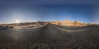 two panoramas of an empty dirt track in the middle of the desert with mountains in the distance
