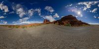 A breathtaking view of the road in Monument Valley, Colorado. The fisheye perspective captures the expanse of the desert landscape, with majestic mountains and rock formations in the distance. Experience the beauty of nature on a road trip through this wilderness.