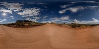 a red dirt road surrounded by clouds and desert on a sunny day with no cars