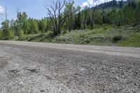 An empty road on a sunny day in Colorado, surrounded by lush green forests and towering mountains. The asphalt and gravel road surface blends harmoniously with the natural landscape. A serene off-road track in Telluride.