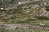 A rugged off-road track in the highlands of Colorado, USA. The grassy surface contrasts with the rocky bedrock and cloud-covered mountain landscape. Experience the alpine biome at Loveland Pass Lake.
