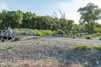 A scenic landscape in Antonito, Colorado. Green trees and lush vegetation surround the Conejos River, while a dirt road and bridge provide an off-road track. Nature and water meet in this picturesque location.