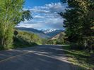 Colorado's scenic landscape featuring straight road stretching towards mountains, lined with vibrant Aspen trees casting hard shadows. Clouds drift lazily on a sunny day, enhancing the natural beauty.