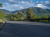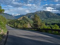 the road winds up on the mountainside on a sunny day with beautiful clouds and trees