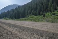 A scenic rural landscape in Colorado. An empty dirt road lined by evergreen trees and mountains. Small dirt tracks on either side add a rustic touch. Perfect for a peaceful drive in the mountains.
